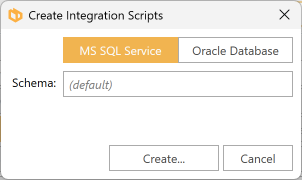The scripts can be generated by clicking on the Create Integration Scripts button in the screenshot above. The form that appears allows you to choose the type of SQL connection and, optionally, the schema name.