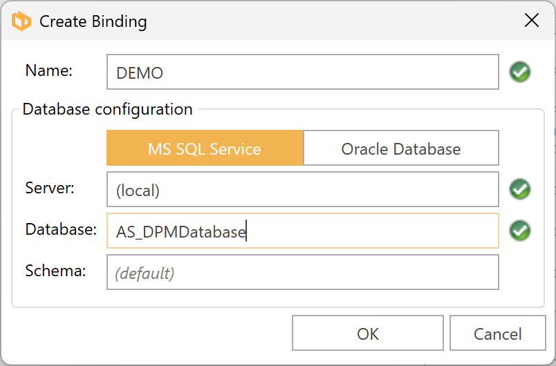 Please note that MS SQL Server or Oracle Database must be selected in this form. The binding information is retained for future use. The schema name should match the one defined when the integration scripts were created, if applicable.