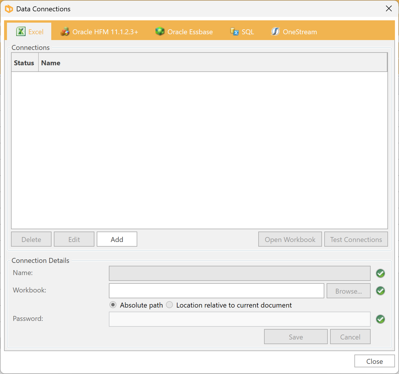 The Data Connections dialog will open where you can create connections to one or many Excel workbooks: