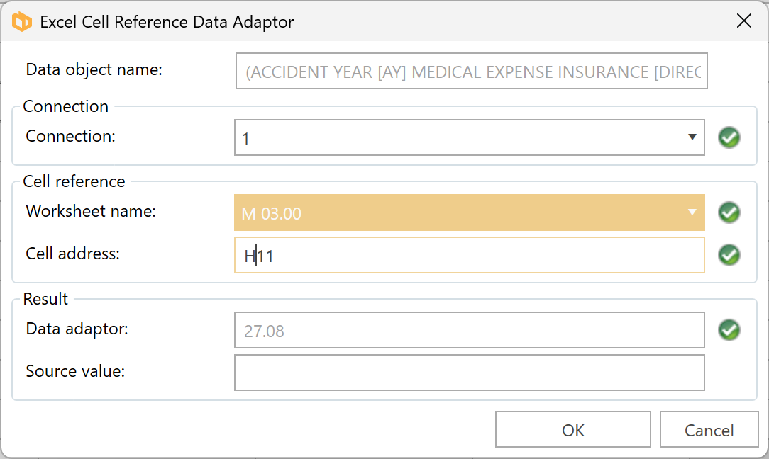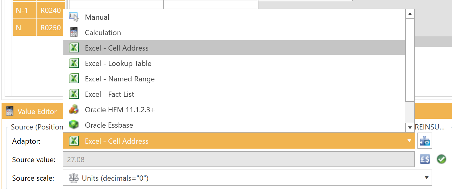 An Excel – Cell reference adaptor can be assigned or changed using the Adaptor control in the value panel: