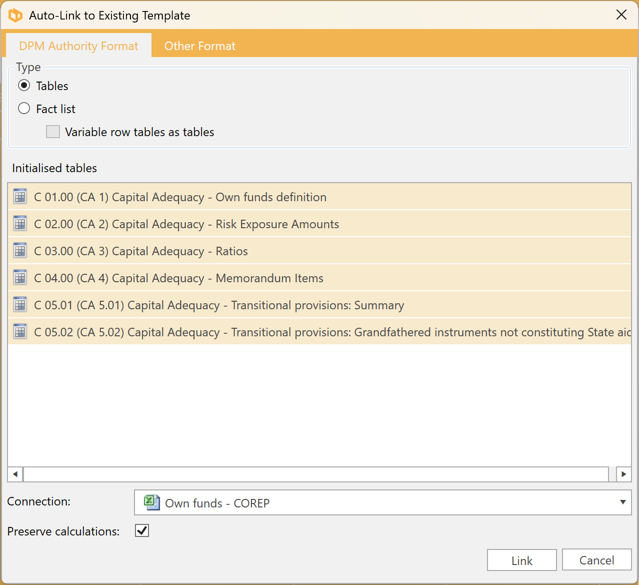 You can select either Tables or the Fact List type in the Excel Import Template that is being auto-linked to. For more information see 4.2 Excel Import Templates - Generating