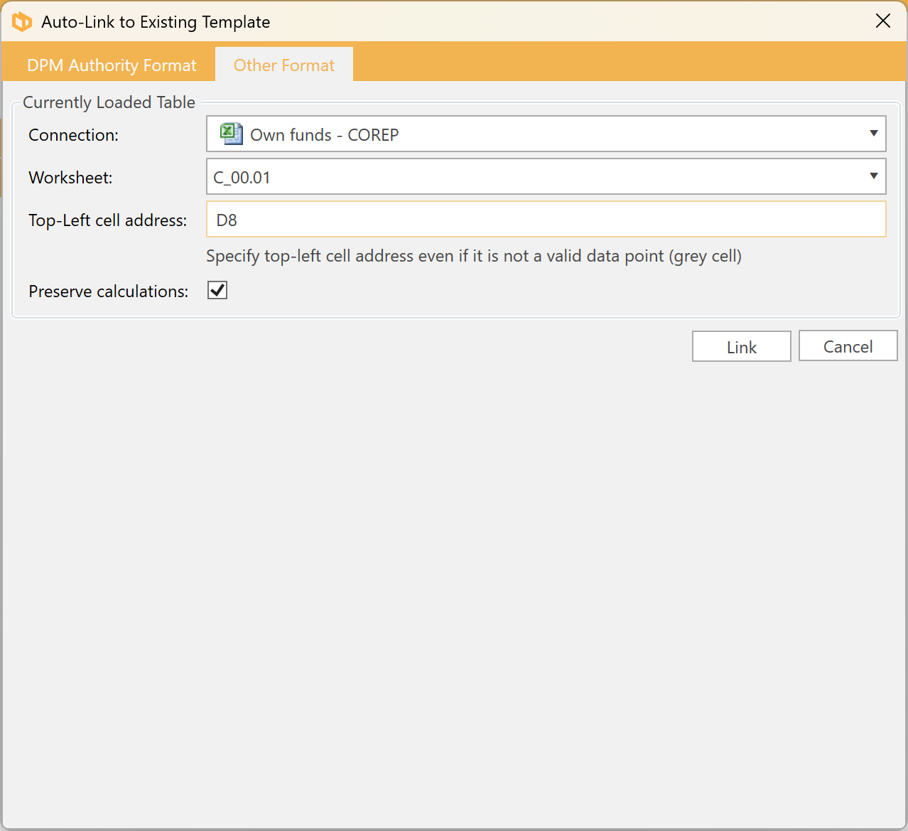 - Preserve calculations - This option is checked by default and will ensure your custom formulae and calculations are not removed in the auto-link process.