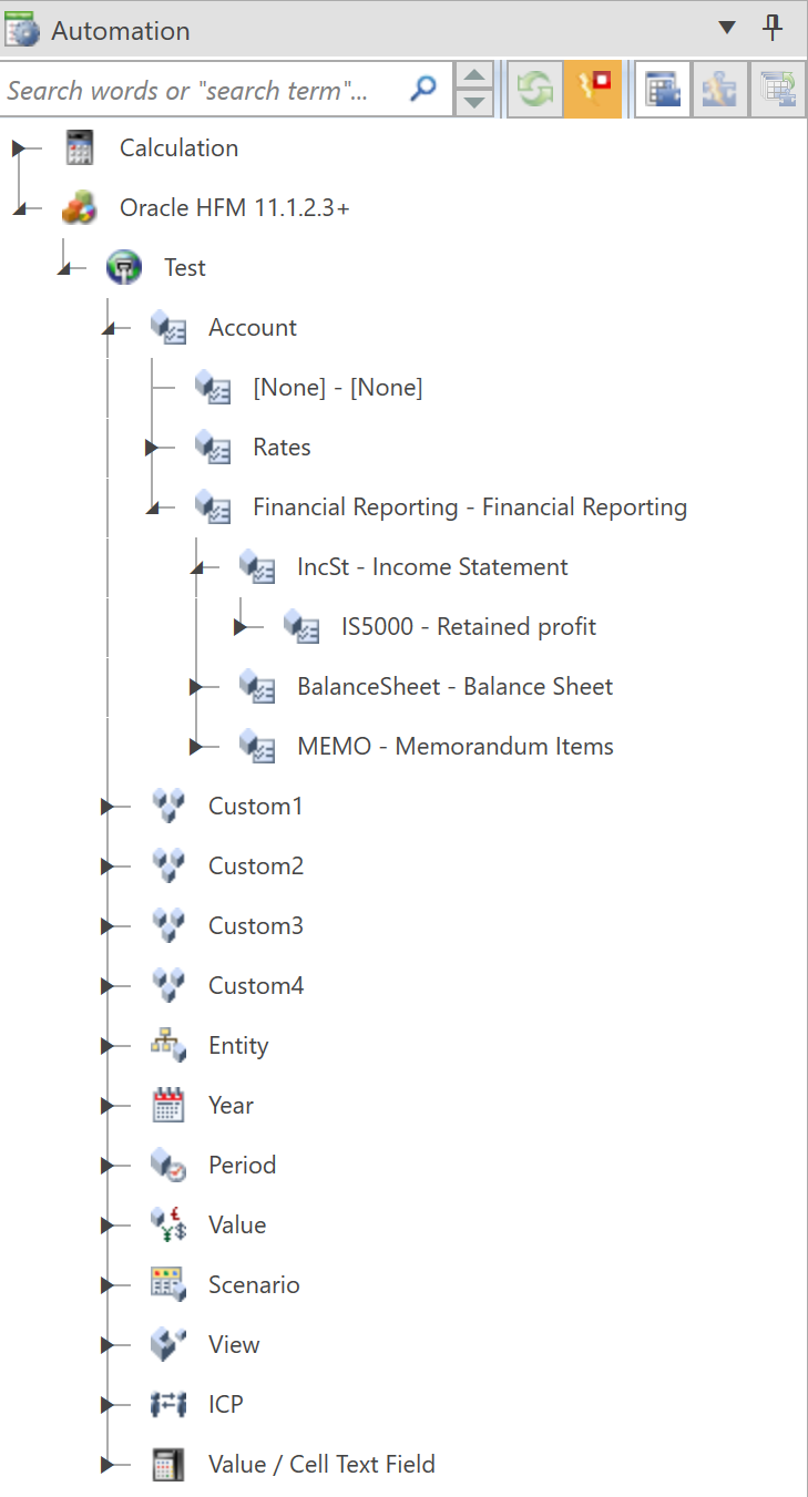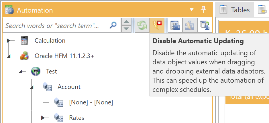 When HFM adaptors are modified by dragging and dropping a member onto a row, column, or entire table, the value of each data adaptor that is modified will be retrieved from HFM. This will introduce a delay between the dropping of a member and initiating the next drag action. This delay will depend on how many objects are updated and the speed of the HFM connection. If the delay is noticeable, you can speed up the mapping process by temporarily disabling auto-update using the toggle button at the top of the Automation panel: