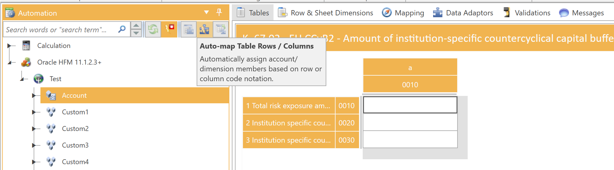 To speed up document mapping, you can automatically assign account or dimension members to all table cells by using the Auto-map Table Rows / Columns button or the shortcut "Ctrl + Shift + M" in the Automation panel: