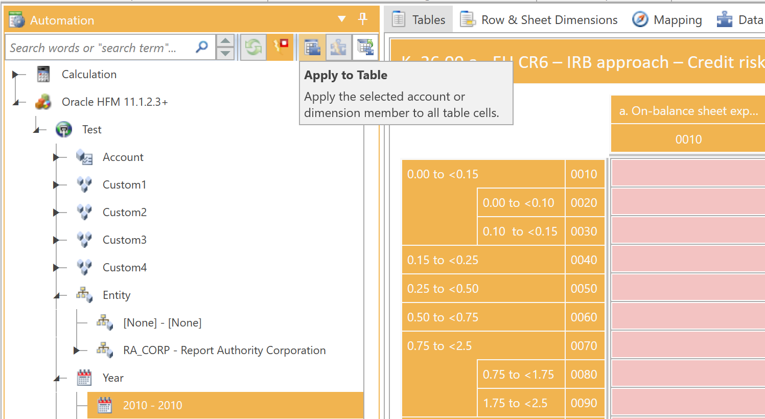 You can select any dimension member in the HFM hierarchy from the Automation panel and apply it to all table cells at once using the Apply to Table button.