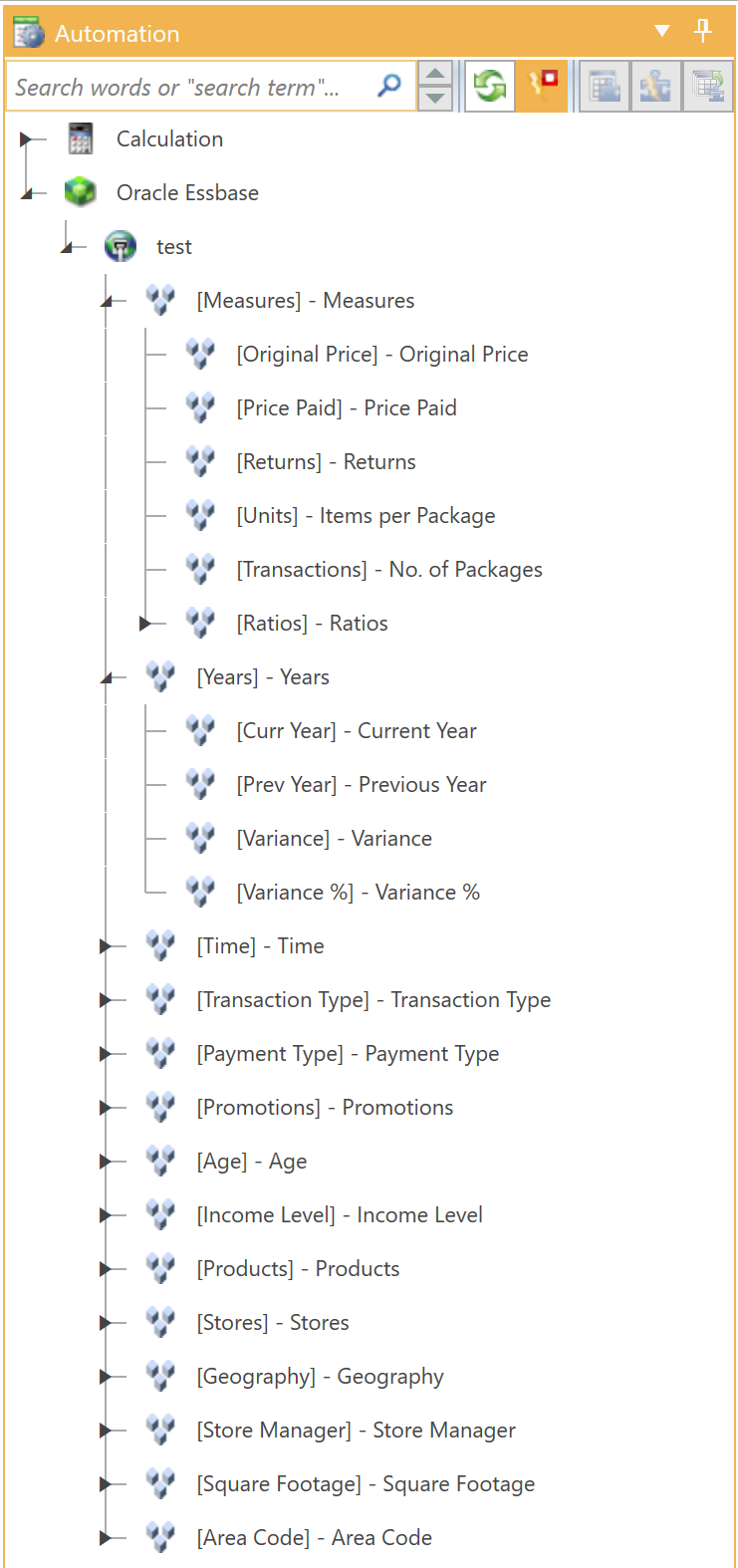 DPM Authority can import data from an Essbase database. This is achieved through the installation of the Oracle Essbase Web Services package released by Oracle - refer to Oracle documentation. Once configured, DPM Authority will list all dimensions and dimension members in the Automation panel which can be used to automate table cells, rows, columns and entire sheets: