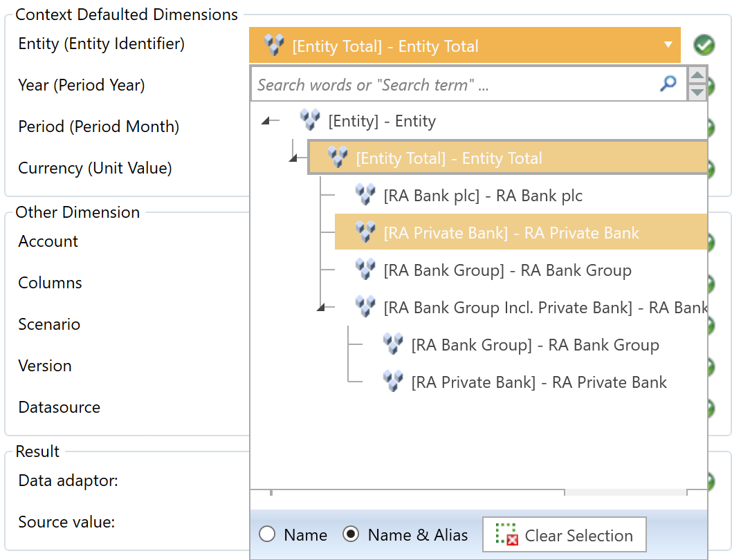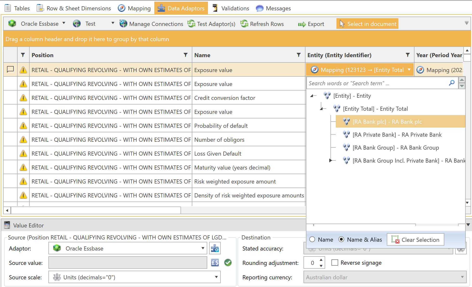 Additionally, you can validate the cells with the assigned dimension members, refresh the rows to check the current status of the cells with the HFM Data Adaptor, and export the existing HFM Data Adaptor values to formats such as Excel, XML, Word, CSV, PDF.