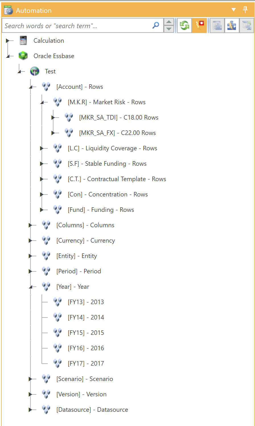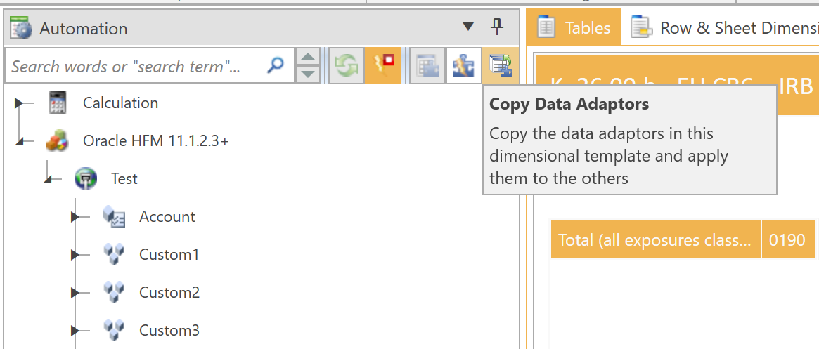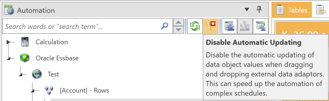 When HFM adaptors are modified by dragging and dropping a member onto a row, column, or entire table, the value of each data adaptor that is modified will be retrieved from Essbase. This will introduce a delay between the dropping of a member and initiating the next drag action. This delay will depend on how many objects are updated and the speed of the Essbase connection. If the delay is noticeable, you can speed up the mapping process by temporarily disabling auto-update using the toggle button at the top of the Automation panel: