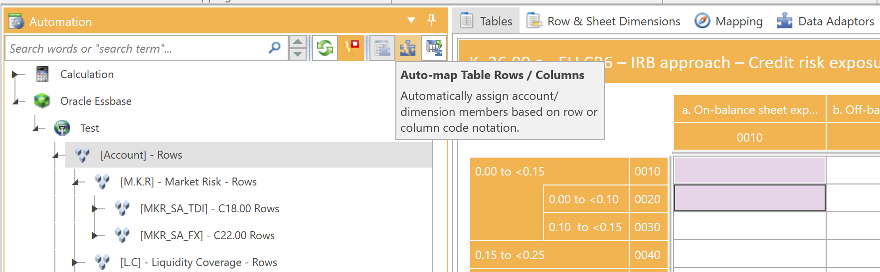 To speed up document mapping, you can automatically assign account or dimension members to all table cells by using the Auto-map Table Rows / Columns button or the shortcut "Ctrl + Shift + M" in the Automation panel: