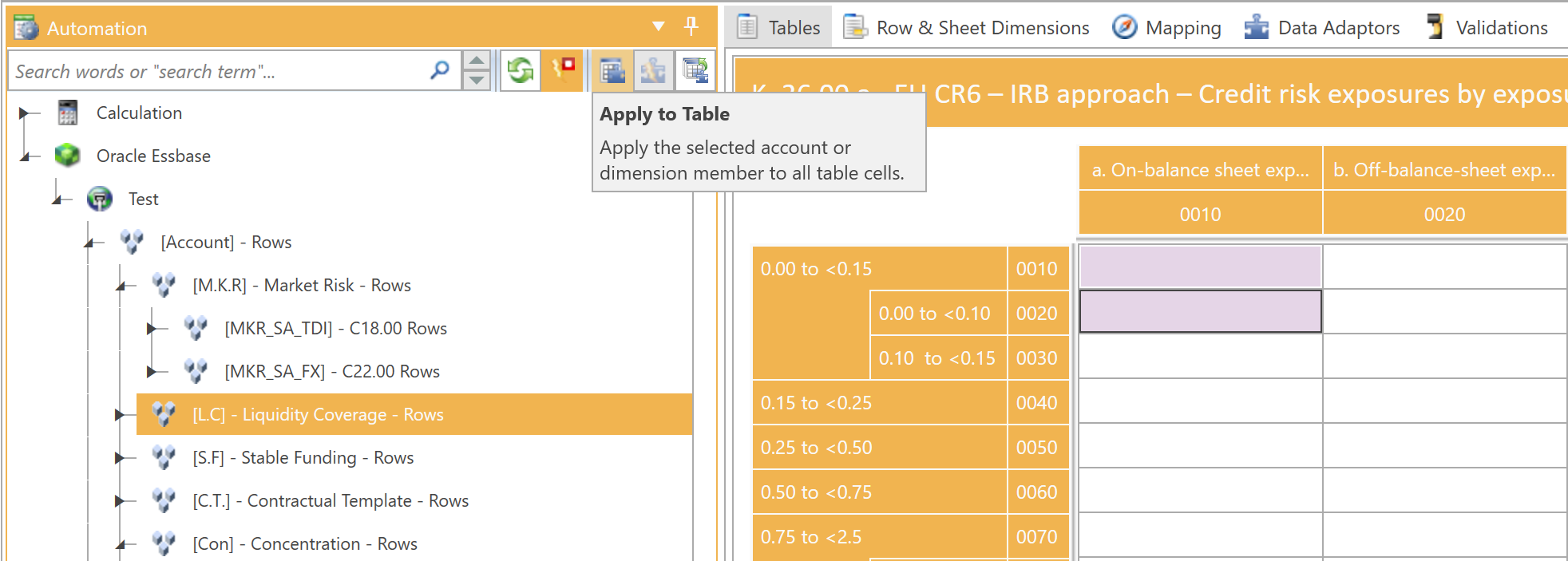 You can select any dimension member in the Essbase hierarchy from the Automation panel and apply it to all table cells at once using the Apply to Table button.