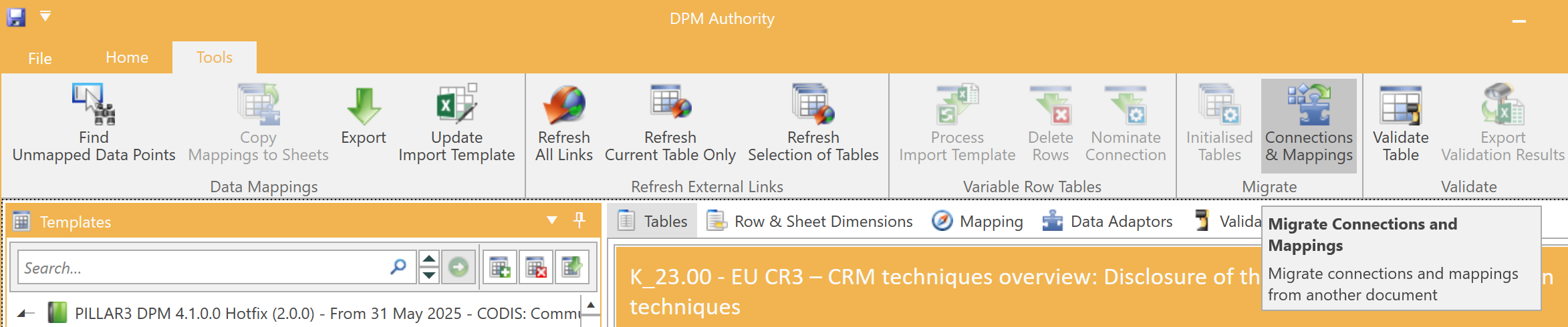 To migrate mappings from documents based on older reporting frameworks, click Tools -> Migrate -> Connections & Mappings: