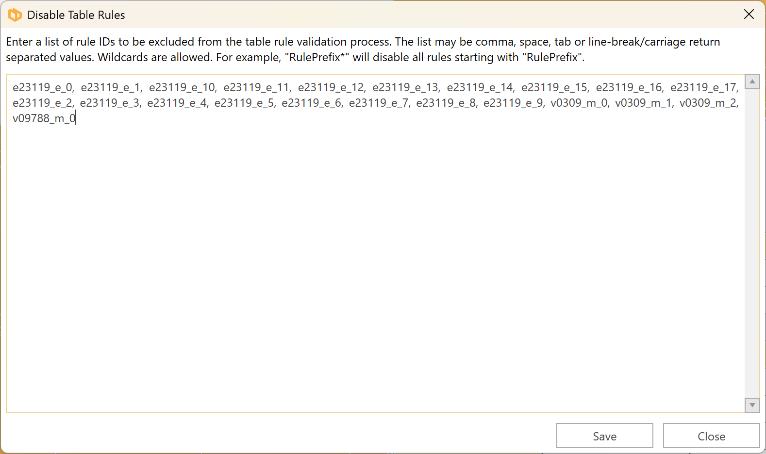 Once you have included all the rules that should be disabled in this form, select Save and the form will close. All rules included in this form will be excluded from the validation process.