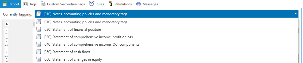 When tagging using 1 or 2 above, Report Authority needs to know into which taxonomy section in the extended taxonomy the tag must be inserted. This is done via the Currently Tagging control above the report: