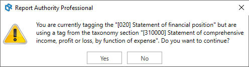In some cases, Report Authority will warn the user if it appears that the tag being used is not appropriate for the Currently Tagging selection: