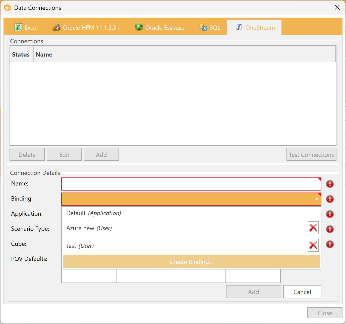 In DPM Authority, click Input - Manage Connections. In the OneStream Connection tab, click Add -> Binding - Create Binding...: