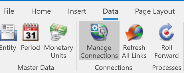 Report Authority can connect to one or more HFM applications in the same document. To create a connection, click Manage Connections on the Data ribbon bar: