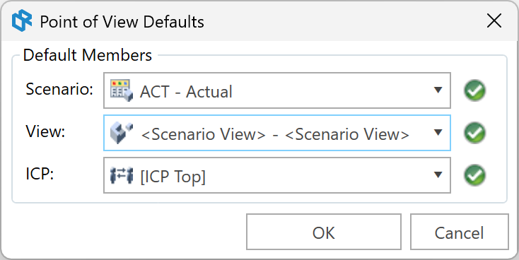 You must select a member from each of the Scenario, View and ICP dimension to be the default member for that dimension. When mapping report objects, it is optional to provide a member from any of these dimensions - their value will be inherited from the connection if no explicit member is given. Furthermore, the Scenario, View or ICP of all existing objects can changed by simply updating the connection's POV Default values.