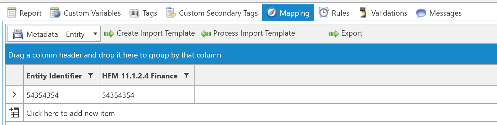 The entity mapping panel is used to map the document's entity identifier used when creating the report - which will be the identifier used to identify the reporting entity with the regulator - to the HFM Entity code.