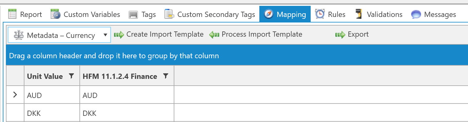 The left column contains the 3 digit currency code or another unit value and the right column (which will default to be the same as the left column) must be the appropriate value in HFM's Value dimension.
