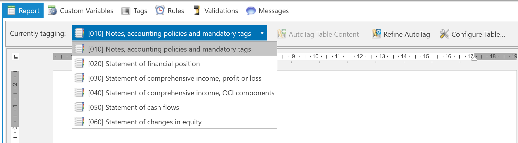 For the mandatory tags, select the first option "[010] Notes, accounting policies and mandatory tags".
