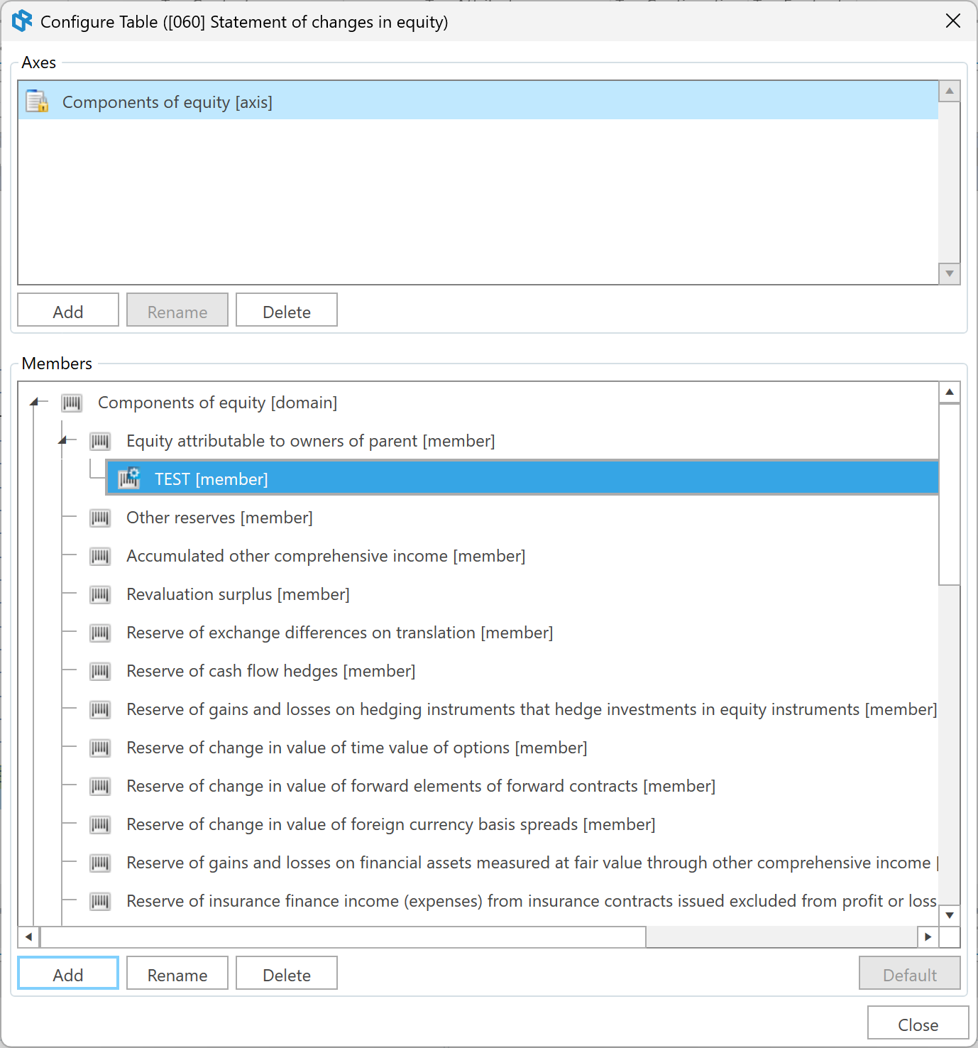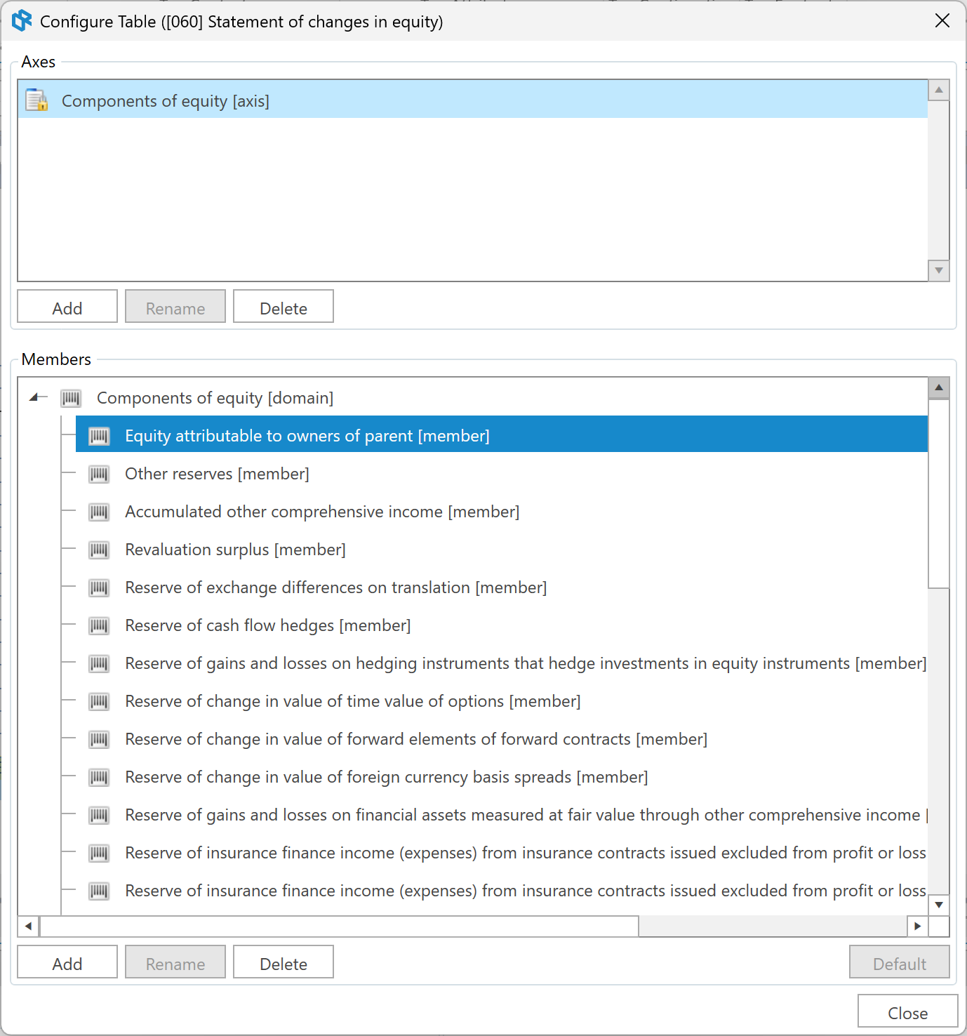 To do this, change the "Currently Tagging:" dropdown list to the Statement of changes in equity and click the configure table button. Click Add in the Axes section and add Components of equity.