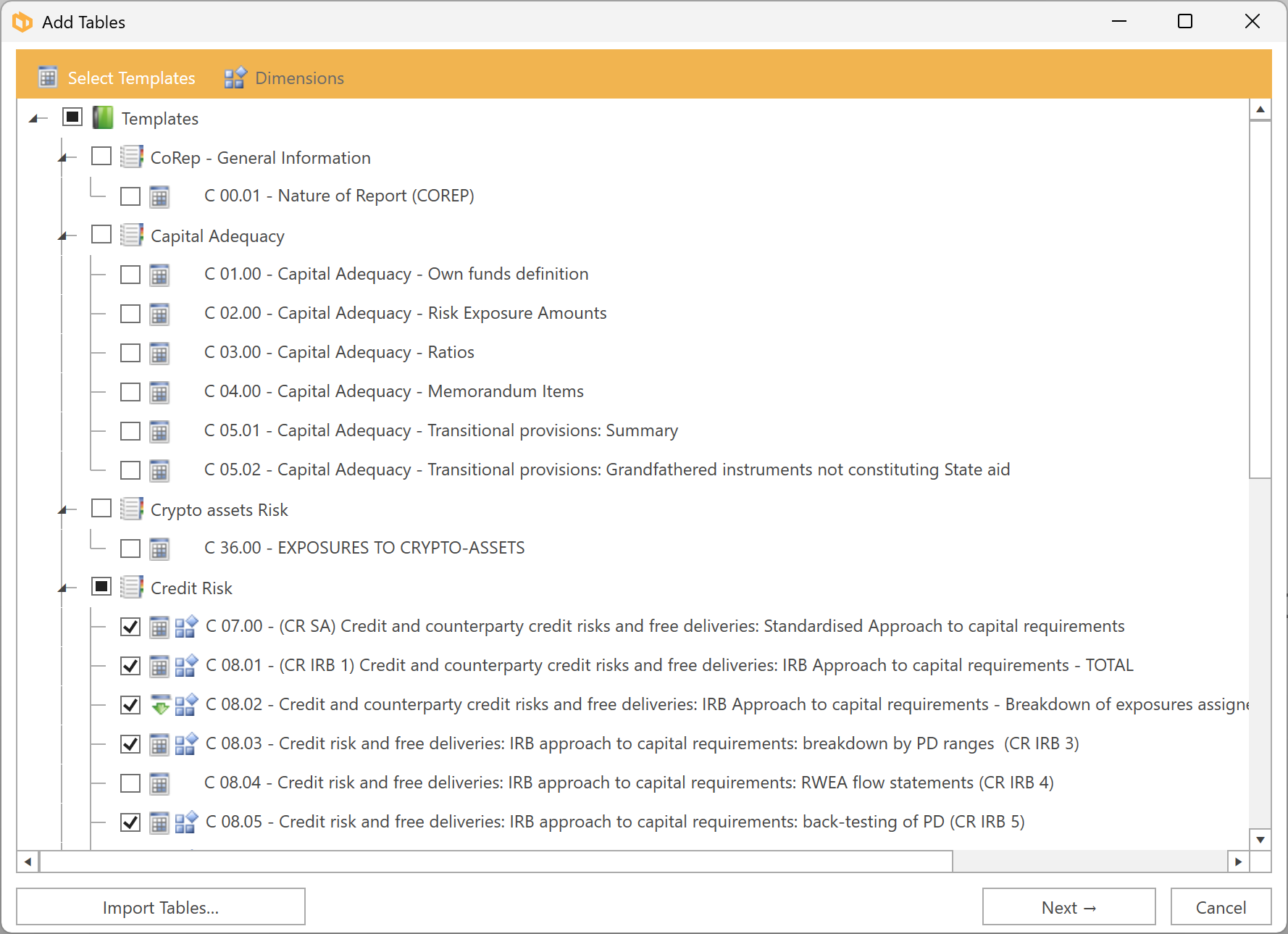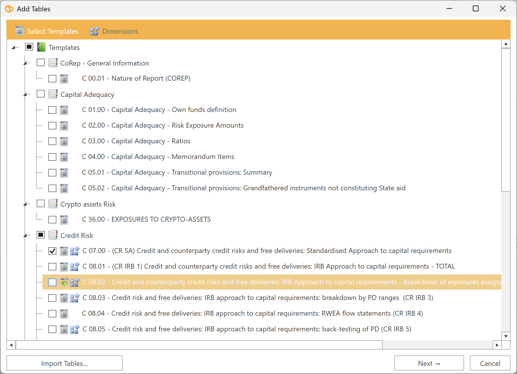 After selecting templates, you choose sheets from a merged list in the Dimensions tab. The Dimensions tab appears only if templates with selectable sheets are chosen (indicated by a blue cube icon), such as C 07.00, C 08.01. C 08.02, C 08.03 & C 08.05 in the screenshot below:
