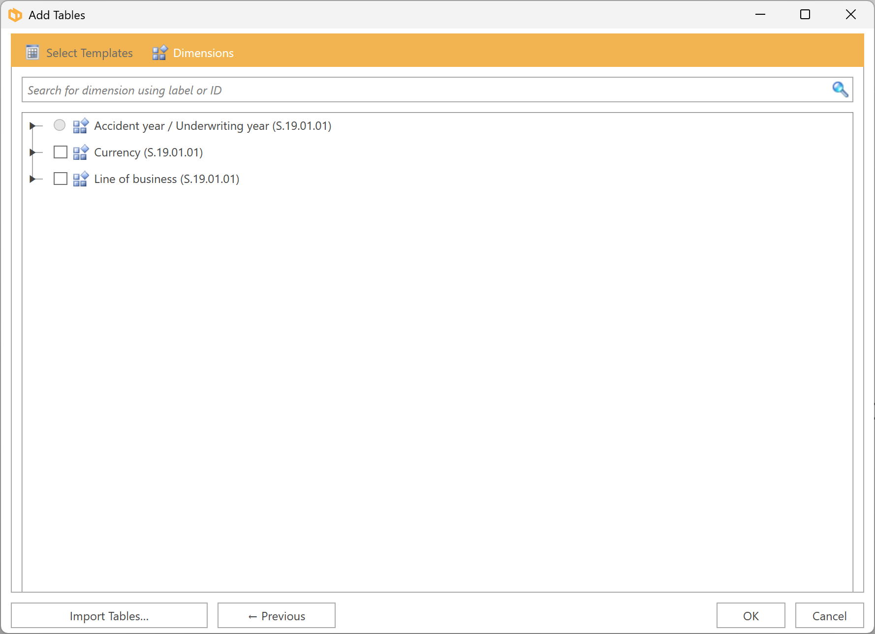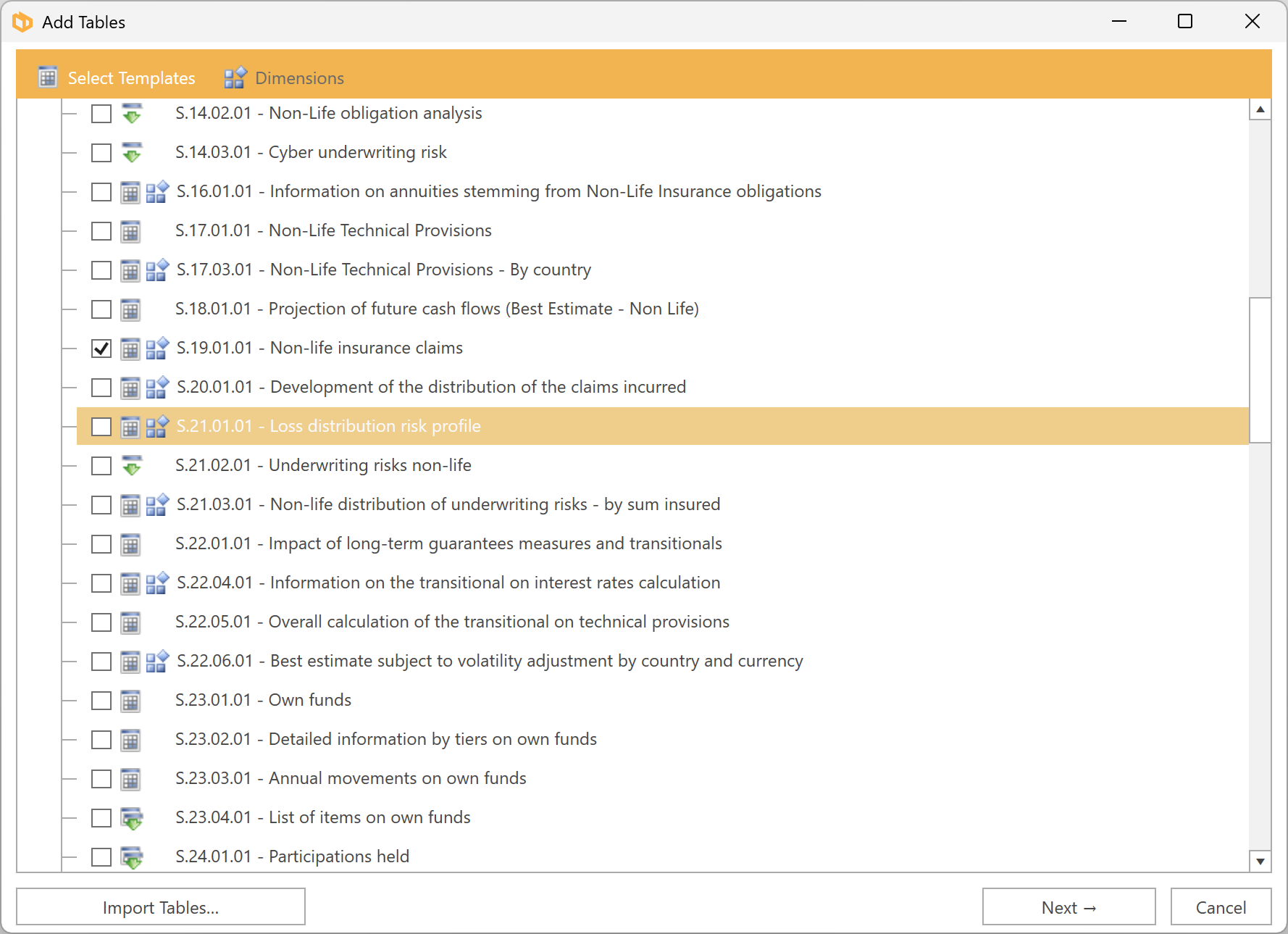 Please note that some templates may have multiple dimensions from which you need to make a selection. For example, if adding S.19.01.01 from the Solvency II Annual Reporting Solo reporting module, you must make a selection from each dimension: