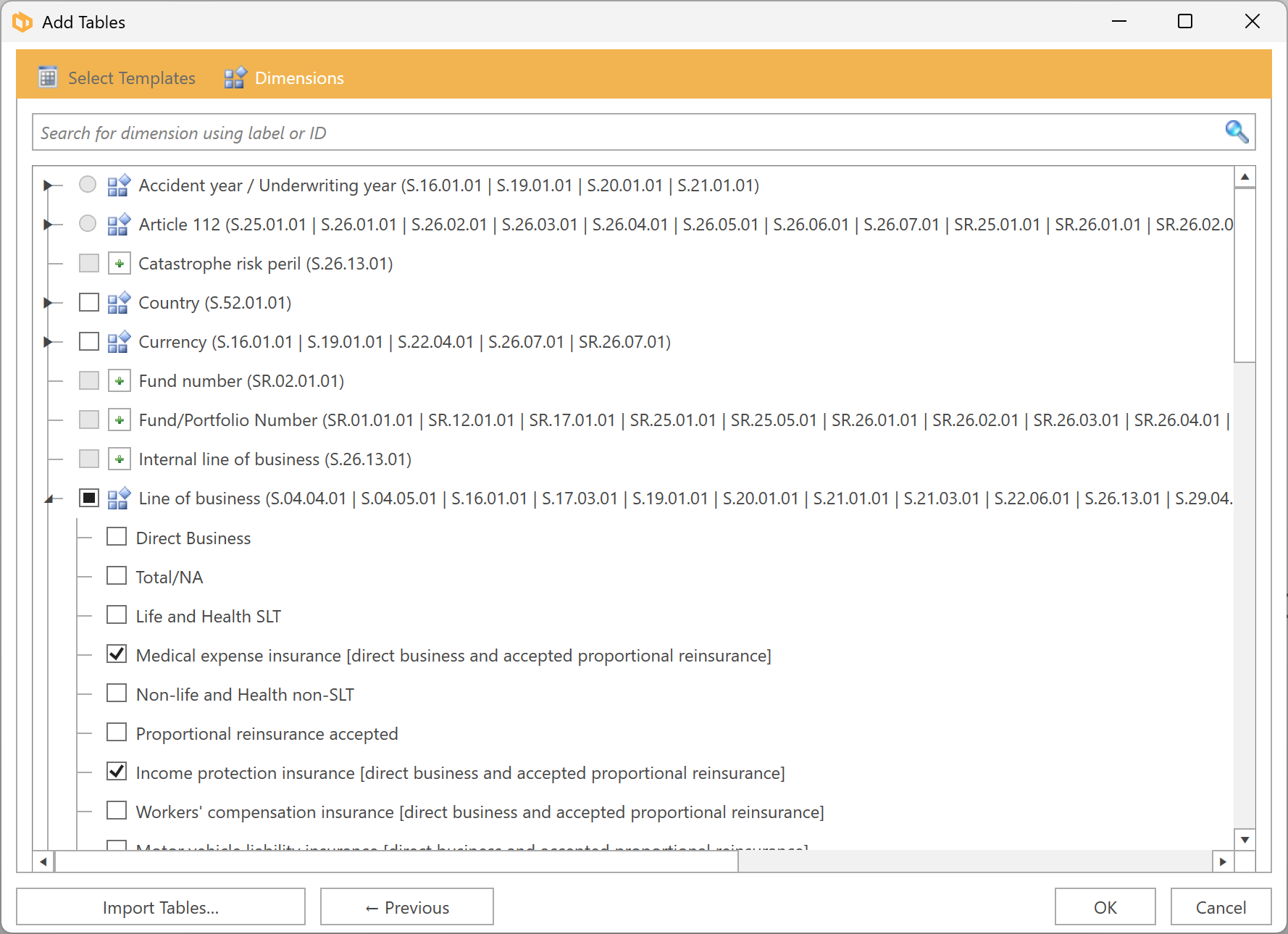 In the Solvency II taxonomy, the dimension "Line of business" appears on many templates. In DPM Authority 14.1, the dimension is merged across all templates, and selecting from a single list of Lines of businesses will apply this selection across all templates that use this dimension: