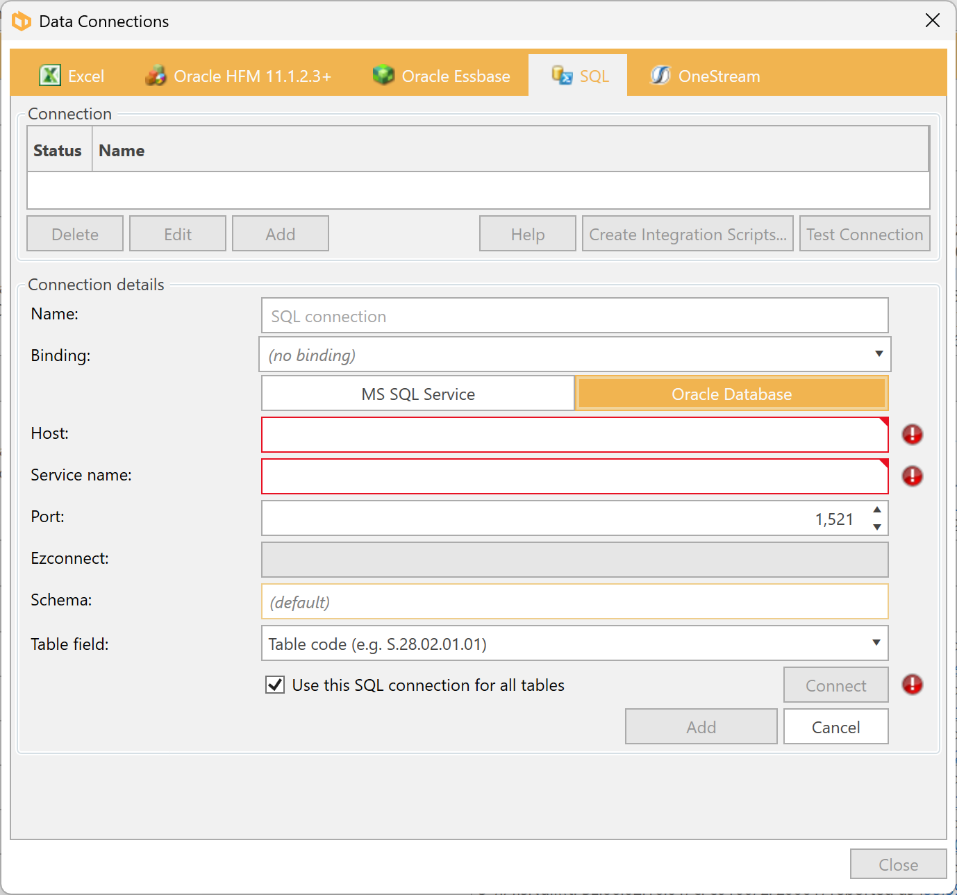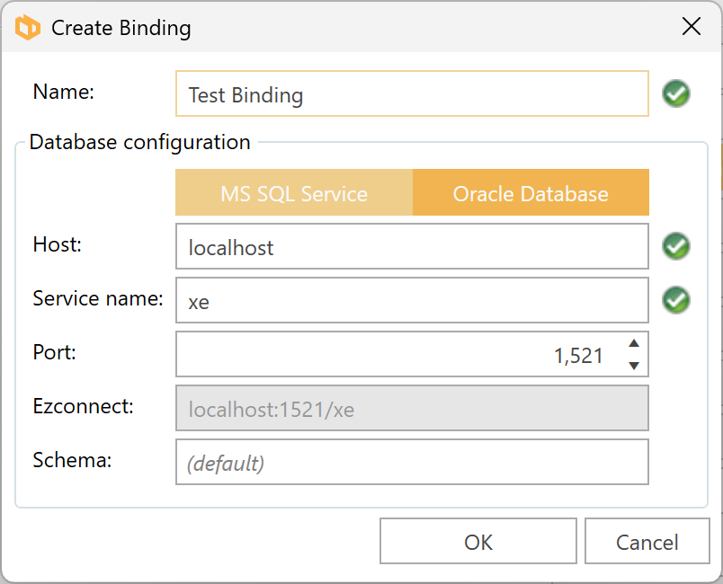 Note that you may skip binding creation and manually provide the Host, Service name and Schema (if applicable).