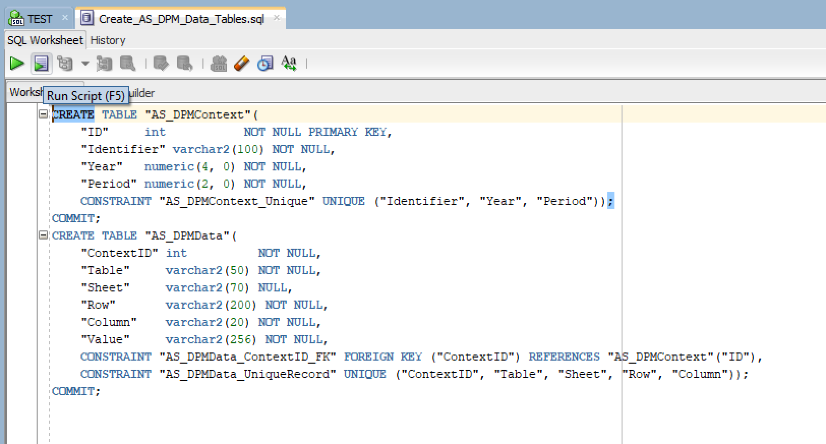 - Create_AS_DPM_Data_Tables.sql. This script creates the two tables (context and data) required for the integration. The script should be edited to include the name of the database which will contain the two tables.