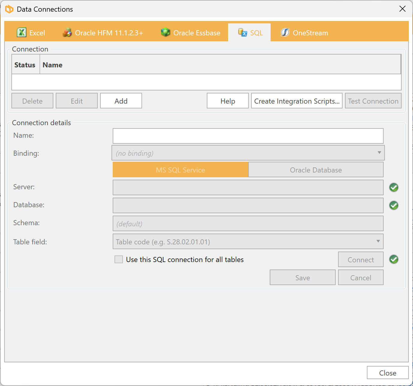 There are two options when creating a connection for retrieving data from SQL — MS SQL Server and Oracle Database. Only one SQL connection can be added to a document at a time.