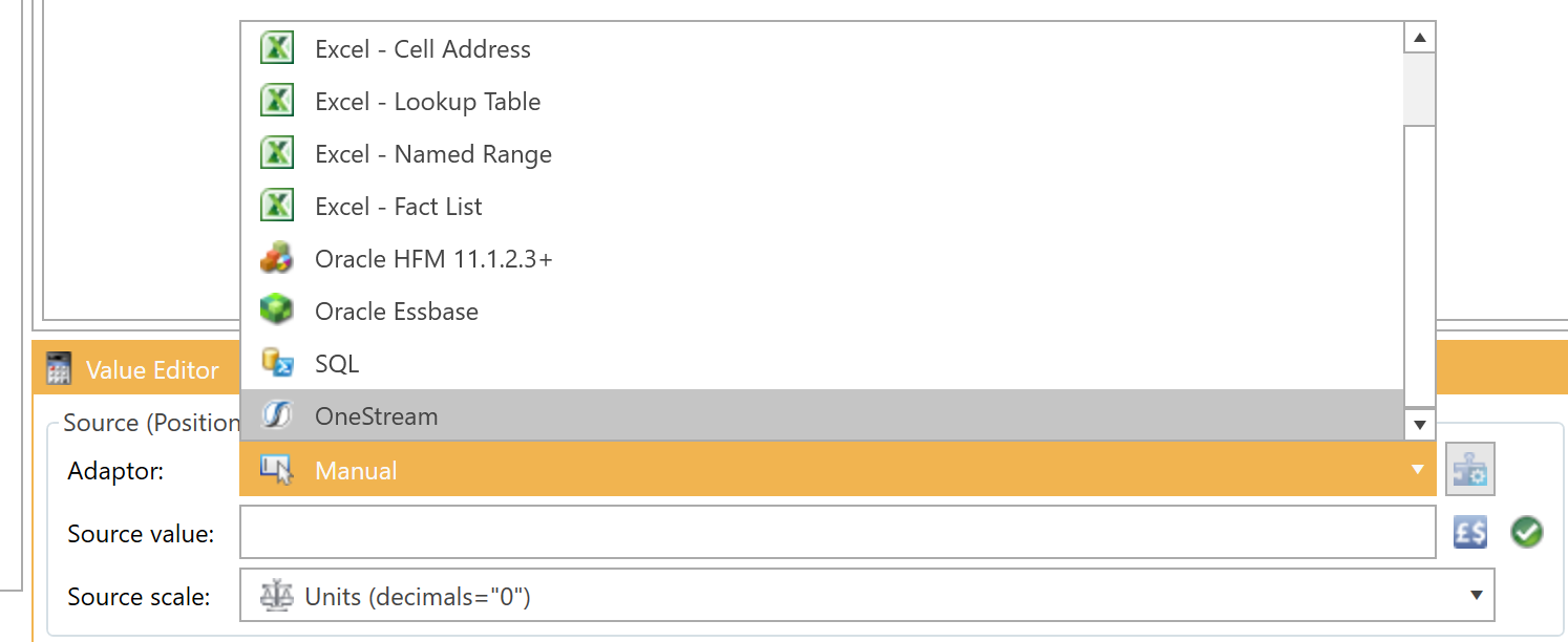 If you change the data adaptor to “OneStream” or click on the Configure Data Adaptor button, the following form will appear: