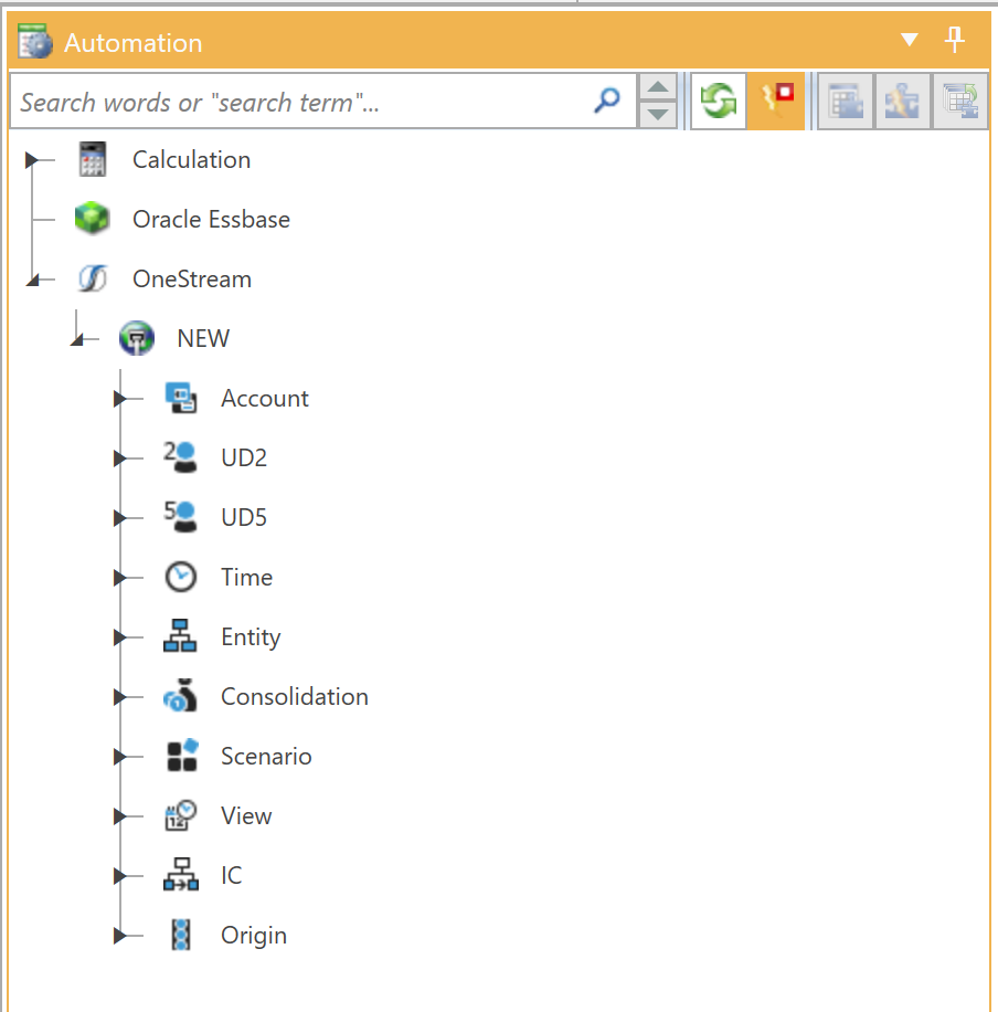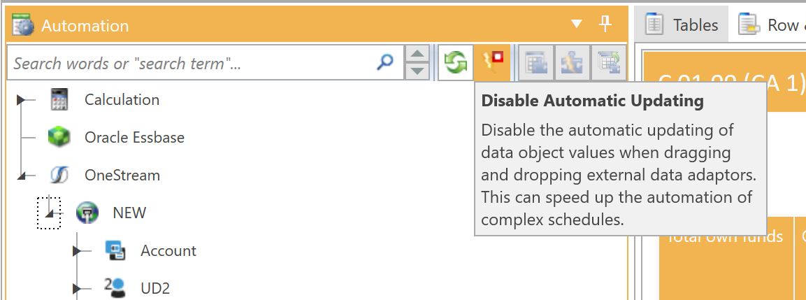 When OneStream adaptors are modified by dragging and dropping a member onto a row, column, or entire table, the value of each data adaptor that is modified will be retrieved from OneStream. This will introduce a delay between the dropping of a member and initiating the next drag action. This delay will depend on how many objects are updated and the speed of the OneStream connection. If the delay is noticeable, you can speed up the mapping process by temporarily disabling auto-update using the toggle button at the top of the Automation panel: