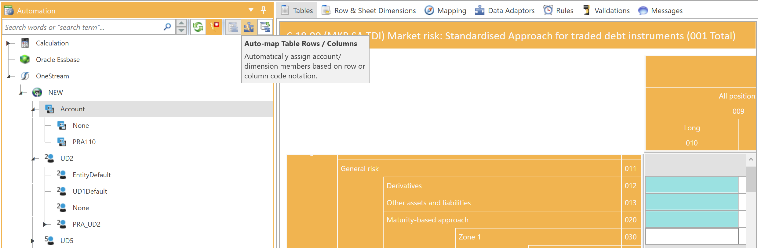 To speed up document mapping, you can automatically assign account or dimension members to all table cells by using the Auto-map Table Rows / Columns button or the shortcut "Ctrl + Shift + M" in the Automation panel: