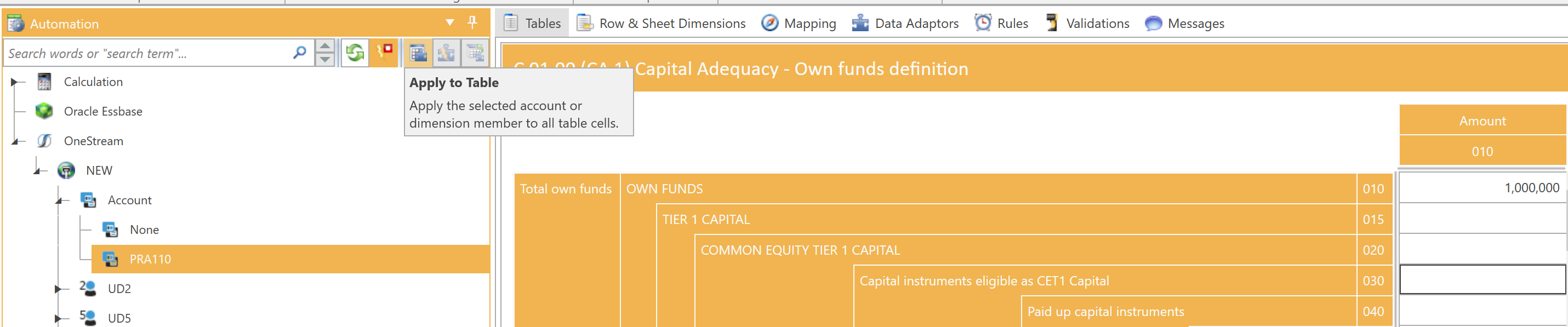 You can select any dimension member in the OneStream hierarchy from the Automation panel and apply it to all table cells at once using the Apply to Table button.
