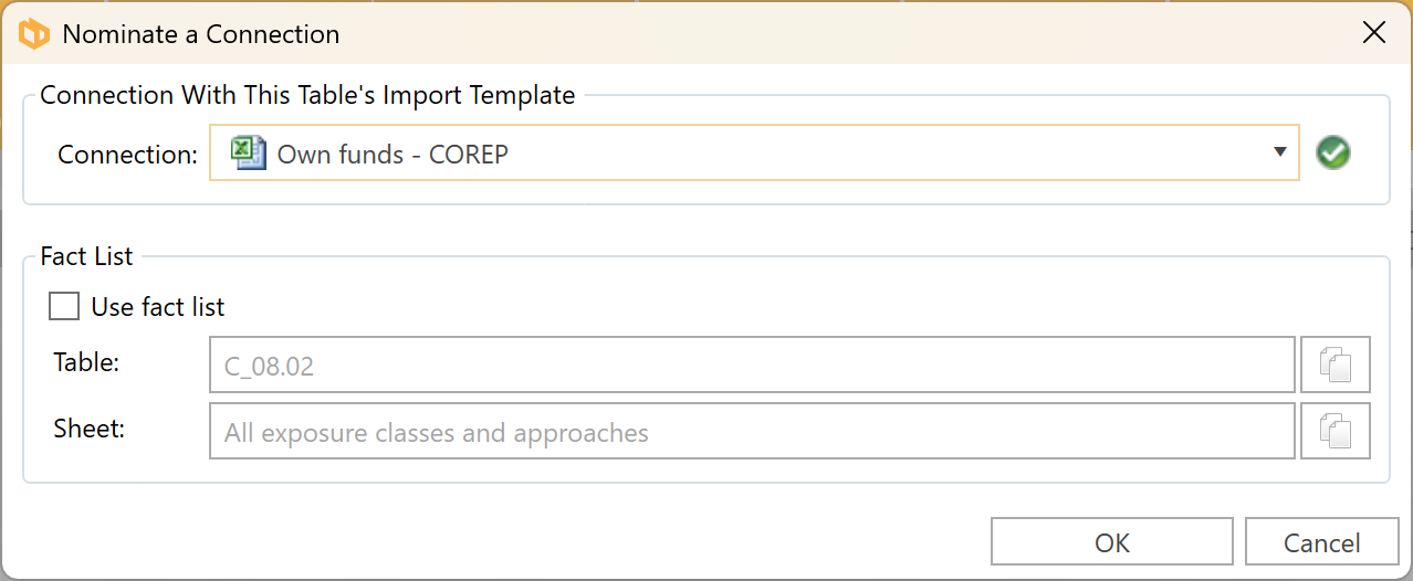 The Nominate a Connection form lists the available connections that can be used during the Refresh Links process. The Fact List type establishes a connection to the Fact List sheet in the Excel Import Template.