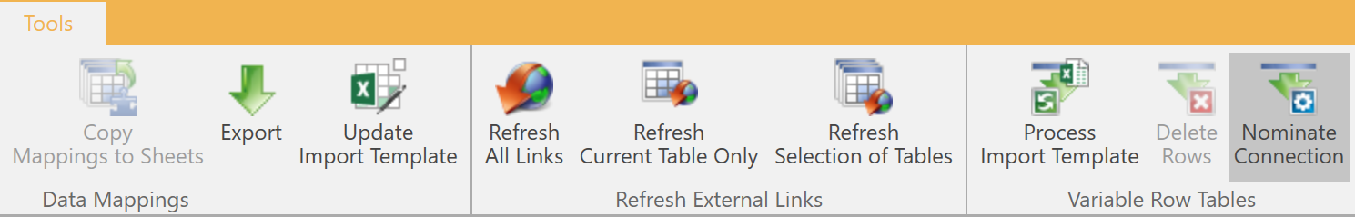 After navigating to a variable row table in DPM Authority, go to Tools → Variable Row Tables to establish a connection to the table’s import template or an SQL connection.