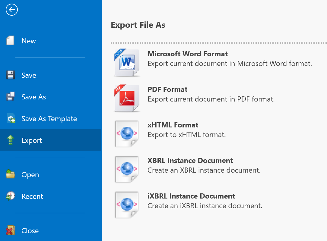 To generate an XBRL or an iXBRL document, click File -> Export.