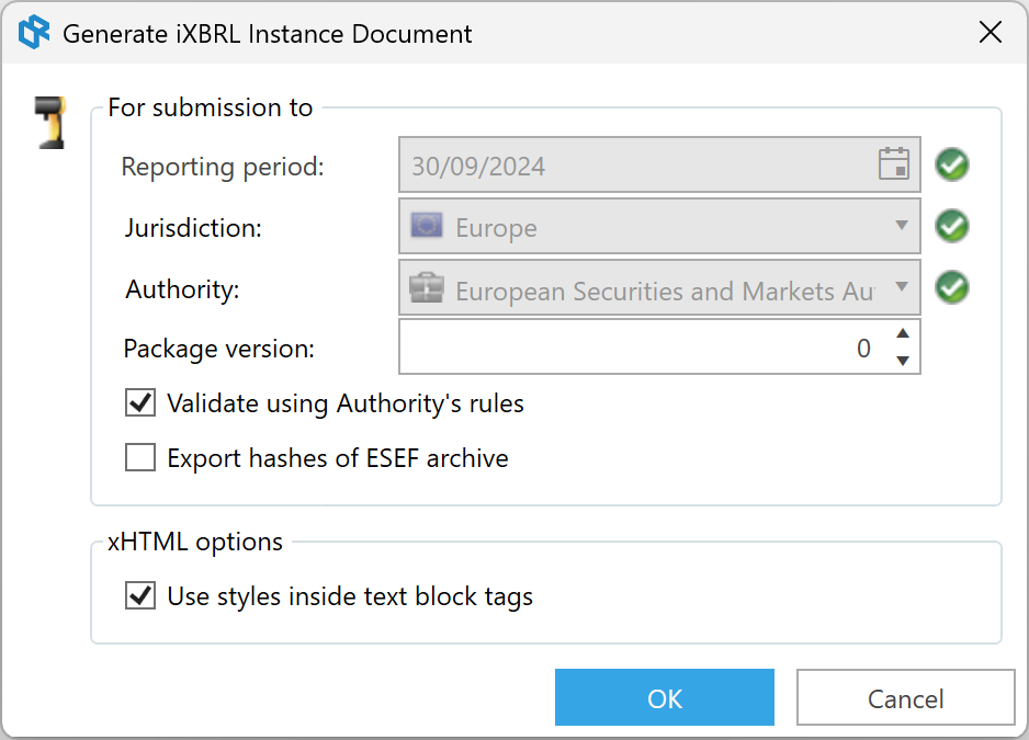 For ESEF exports, additional options are available, such as selecting the package version, exporting ESEF archive hashes, and using styles within text block tags, if required.